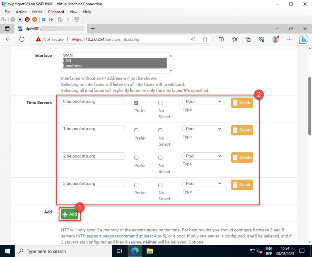 In the “Time Servers” section, you can set up the time servers that your pfSense NTP service will use to synchronize time. In my case, since my on-premises servers are located in Belgium, I opt for the pool zones specific to Belgium from pool.ntp.org. You can simply press “+Add” to include additional time servers.