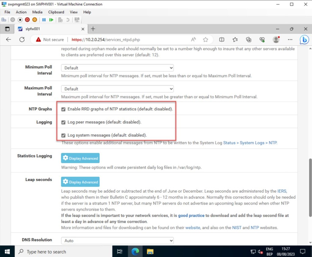 For logging purposes, it’s recommended to activate “Enable RRD graphs for NTP statistics“, “Log peer messages“, and “Log system messages“.