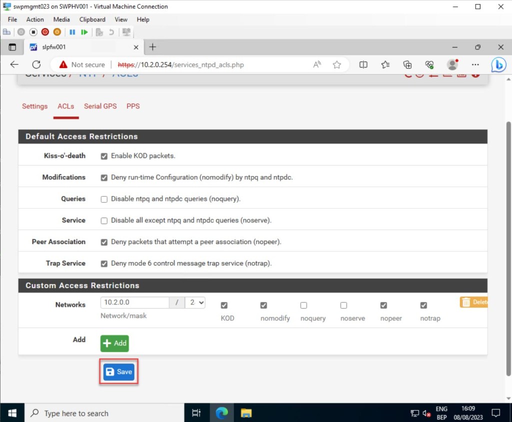 You also have the option to set up network access restrictions, permitting only a designated group of servers or clients to access time services from your pfSense NTP server. For instance, in my example, I included a specific IPv4 range. If you need to add more networks or hosts, just click the “Add” button.