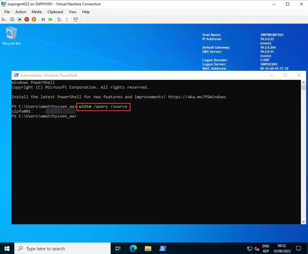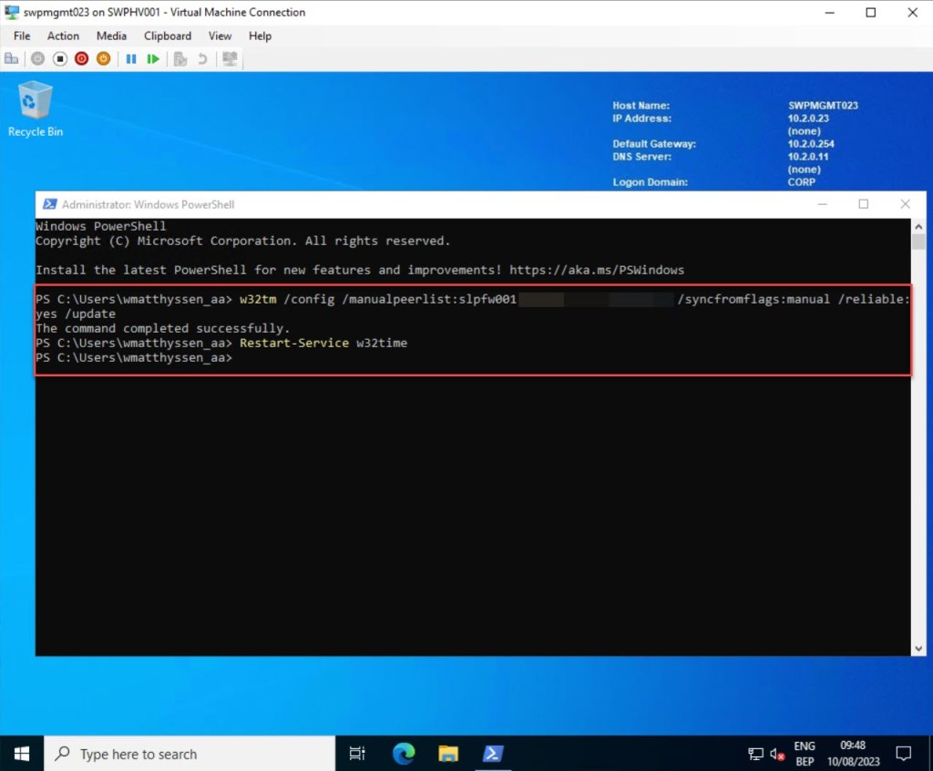 Then, to set the current time manually on your management server (with the Tim synchronization Integration Service disabled on the VM level) or on any other server with the NTP server running on your pfSense VM, simply execute the following command in a PowerShell window (with administrator privileges) on the management VM: