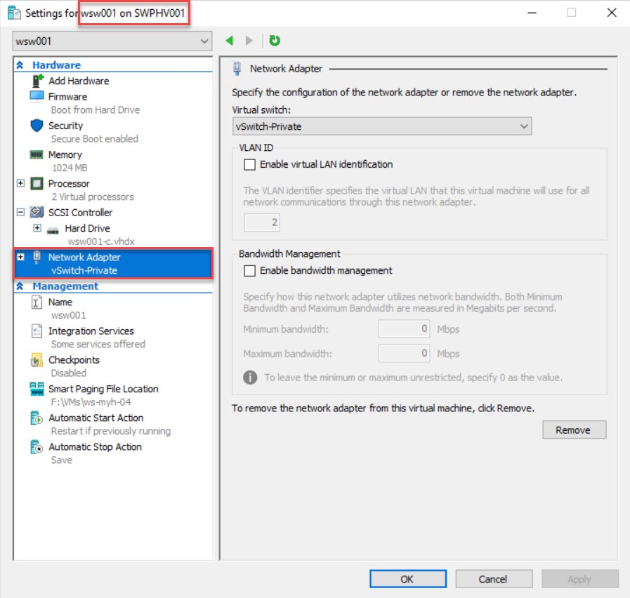 - Two Hyper-V virtual switches, one for your internal LAN connections (Private) and the other for your WAN connections (External).
