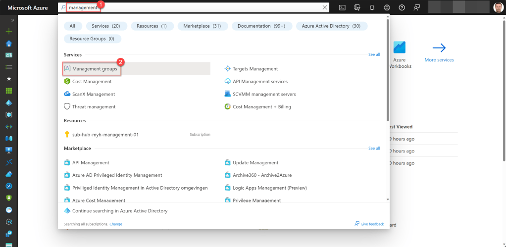 Logon to the portal and type in “management” in the global search box in the top bar. Then select Management groups.