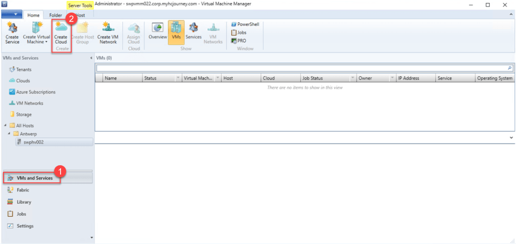 First, log in to your VMM management server and open the VMM console. Then, navigate to “VMs and Services” and click on “Create Cloud” in the top ribbon to launch the “Create Cloud Wizard“.
