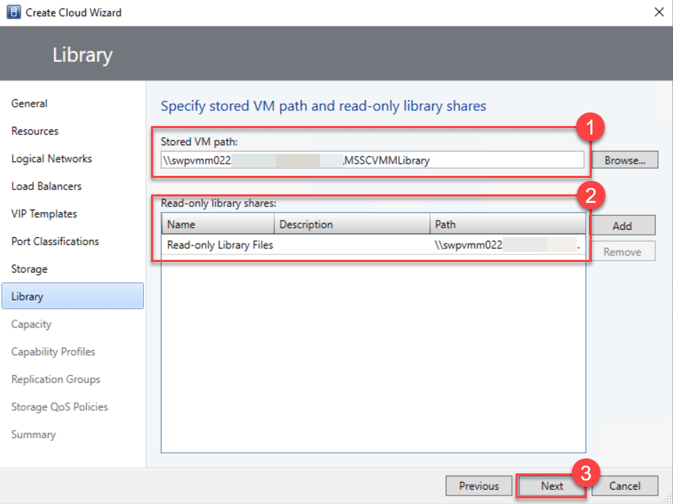 - To assign read-only shares in the private cloud for administrators to store resources like .iso files for self-service users, ensure you have one or more existing library shares available for this purpose.