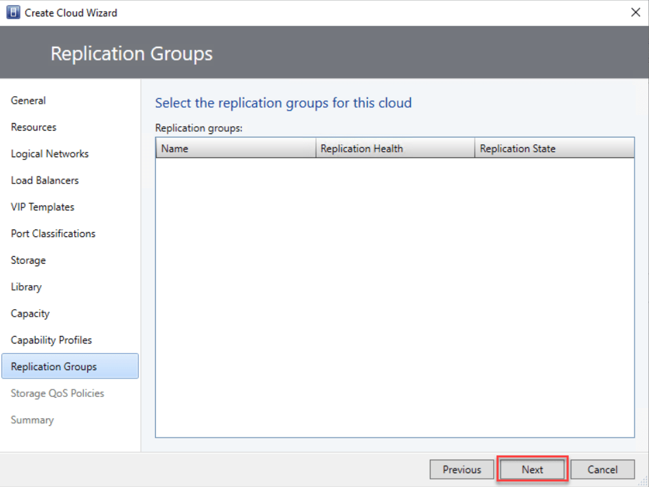 On the Replication Groups page, pick the replication groups you’d like to make accessible within the private cloud and click “Next” to proceed.
