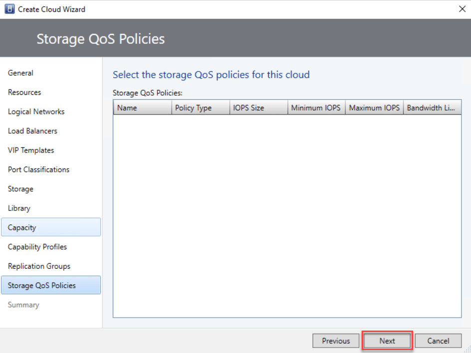 On the Storage QoS Policies page, choose the storage QoS policies you want to make available in the private cloud. Then, click “Next” to continue.