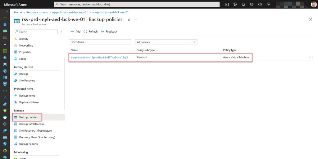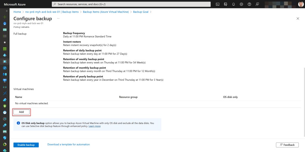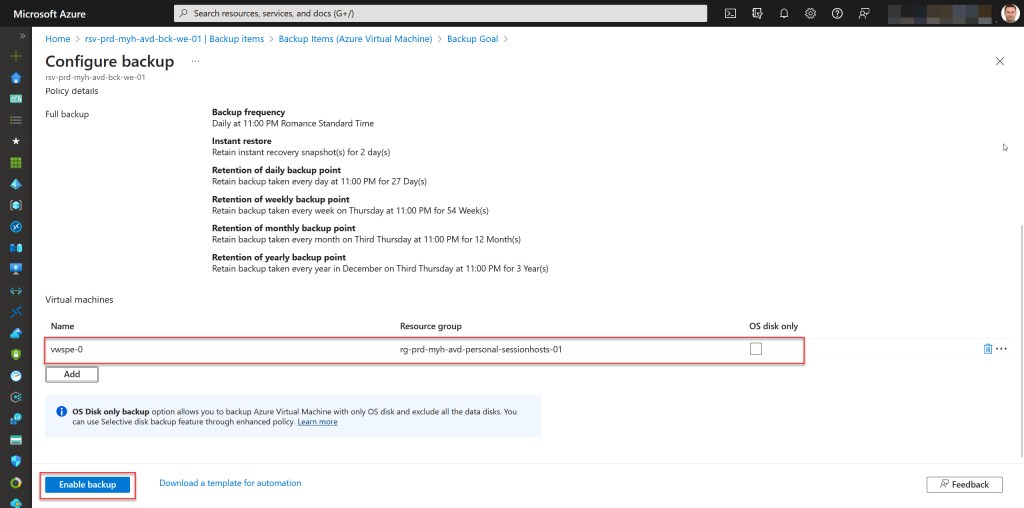 After deploying the backup policy, you can add your AVD personal session hosts* as protected items within your Recovery Services vault.