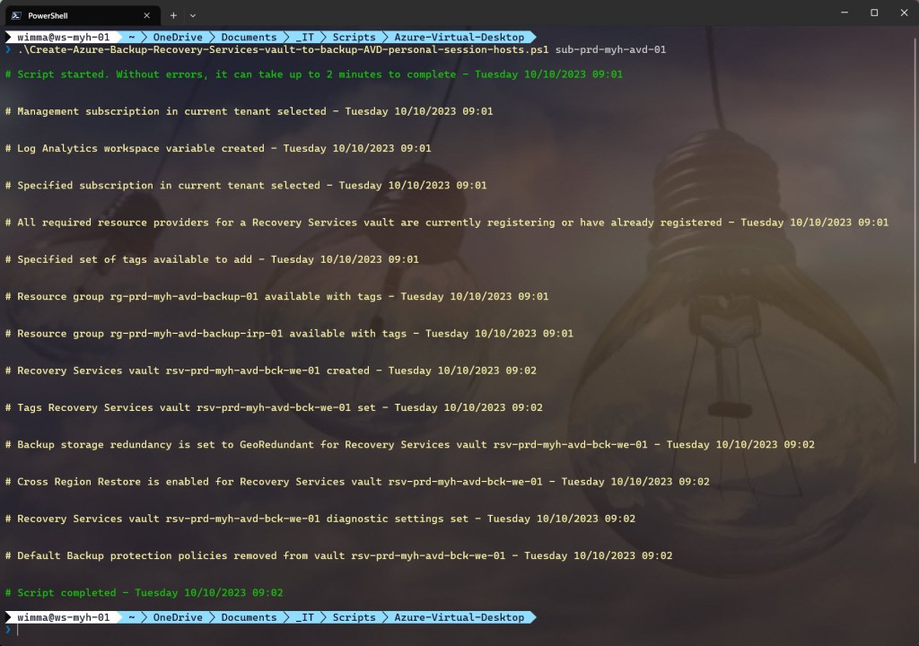 .\Create-Azure-Backup-Recovery-Services-vault-to-backup-AVD-personal-session-hosts -SubscriptionName <"your Azure (AVD) subscription name here">