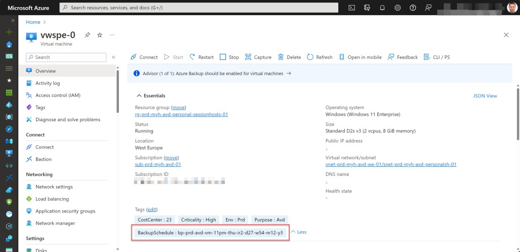 *For governance and management reasons, it’s recommended to attach a tag to the Azure VM resource specifying the backup protection policy in use.
