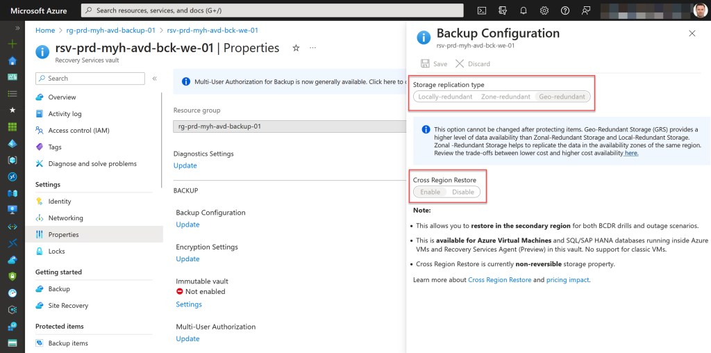 Specify the type of backup storage redundancy for the Recovery Services vault (which can be modified only if there are no backup items protected in the vault).