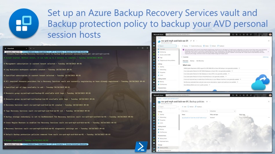 To automate the deployment and configuration process of the necessary Recovery Services vault and Backup protection policy for protecting all these personal desktop VMs, I wrote two PowerShell scripts. You can find more details and all about how you can use these scripts below.