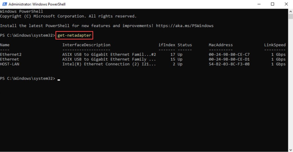 Sign in to the Hyper-V host using an administrator account, and then open a Windows PowerShell window with administrative privileges. Next, enter the following cmdlet to retrieve information about all network adapters available to the system: