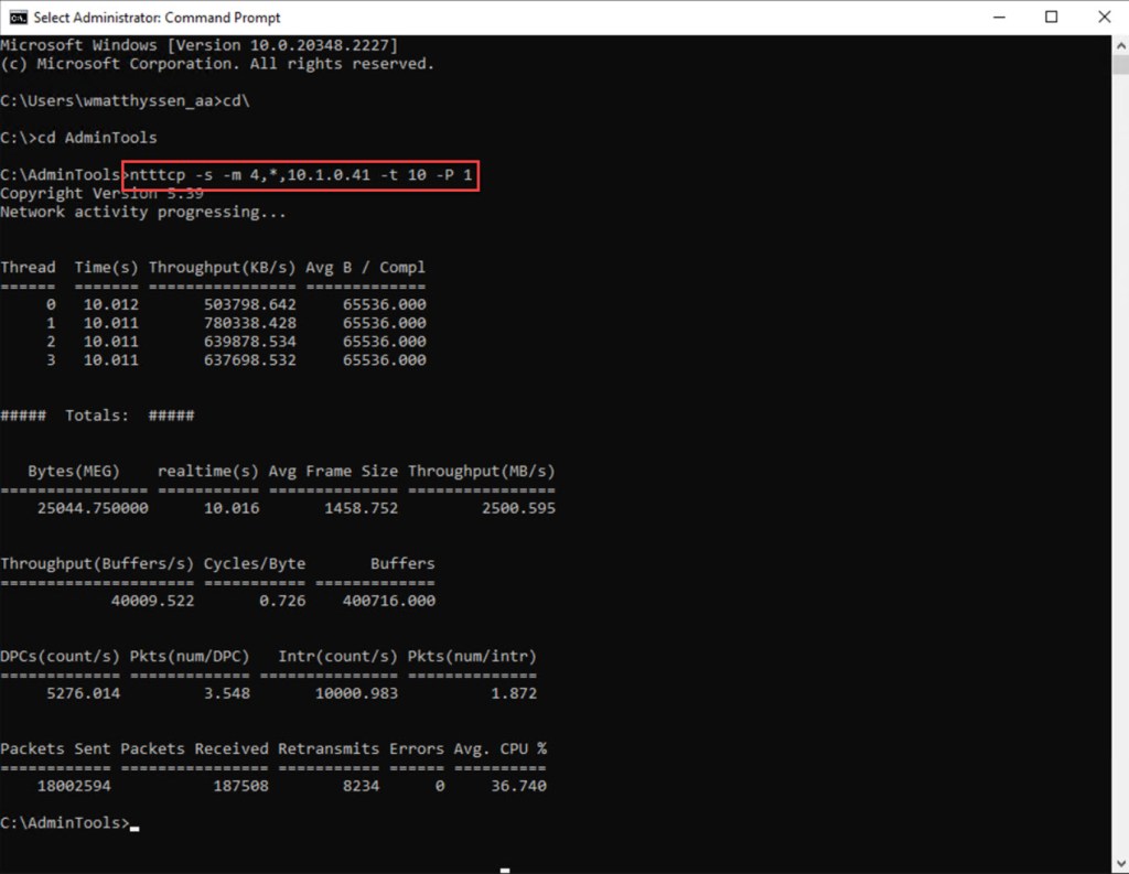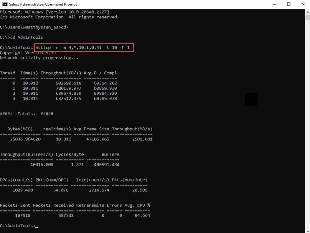 ntttcp -r -m 4,*,<receiver IP address> -t 10 -P 1