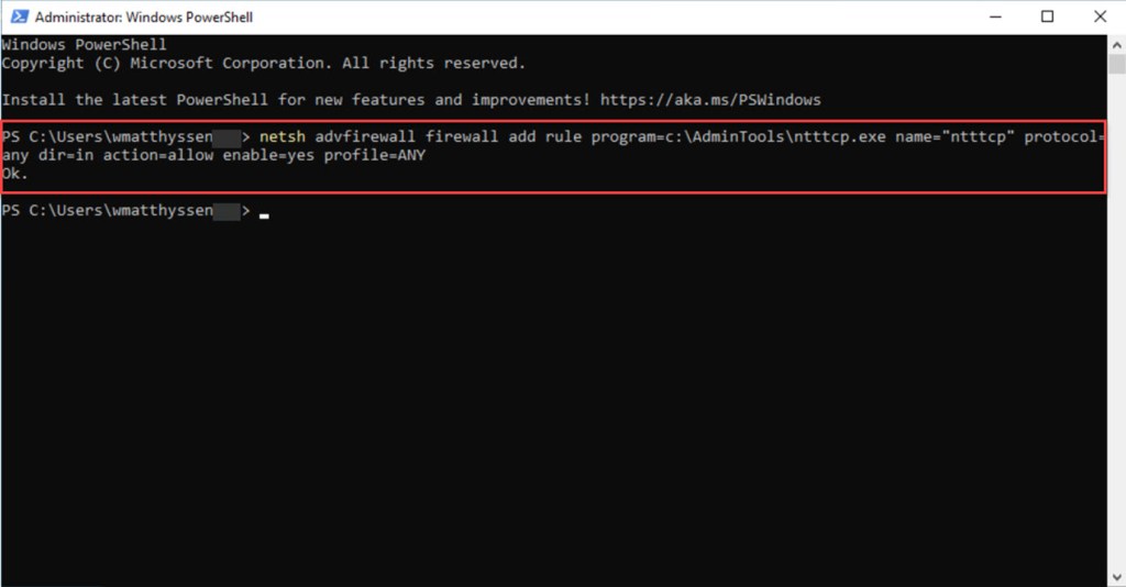 On the receiver VM, set up a Windows Firewall rule to permit NTTTCP traffic. It’s simpler to allow nttcp.exe by name rather than specifying individual inbound TCP ports. Just open a PowerShell window and run the following command: