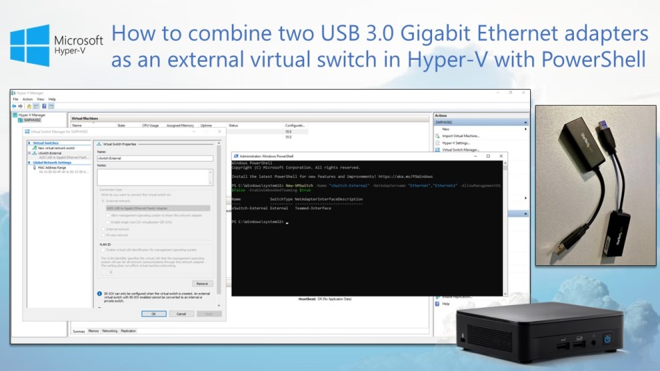 This blog post will guide you through the process of combining two USB 3.0 Gigabit Ethernet adapters and utilizing them as an external virtual switch in Hyper-V.