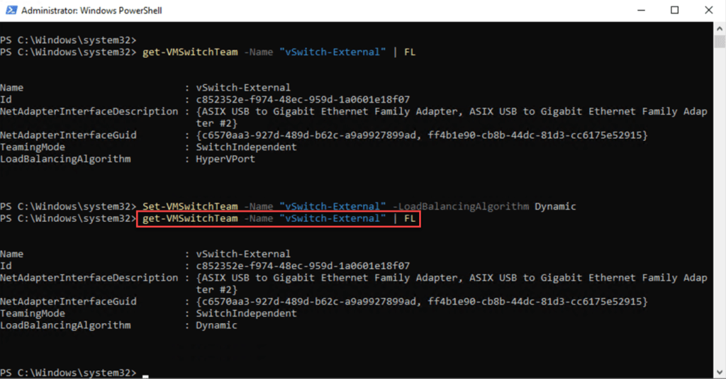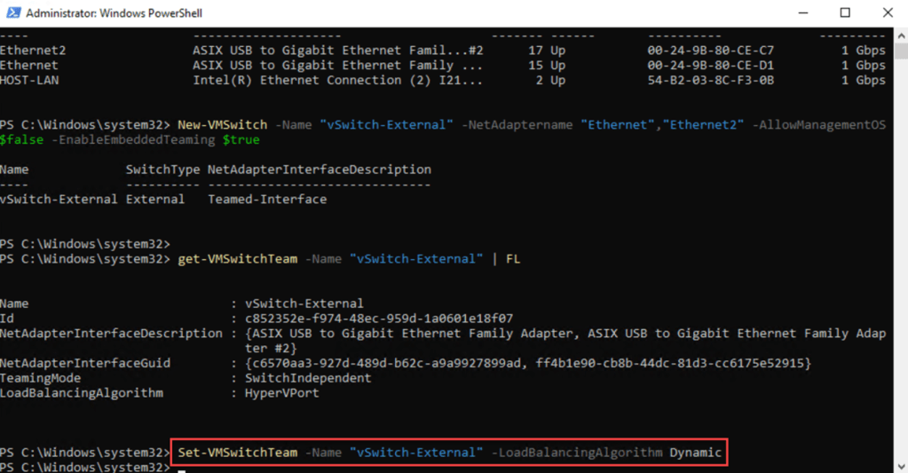 Set-VMSwitchTeam -Name "vSwitch-External" -LoadBalancingAlgorithm Dynamic