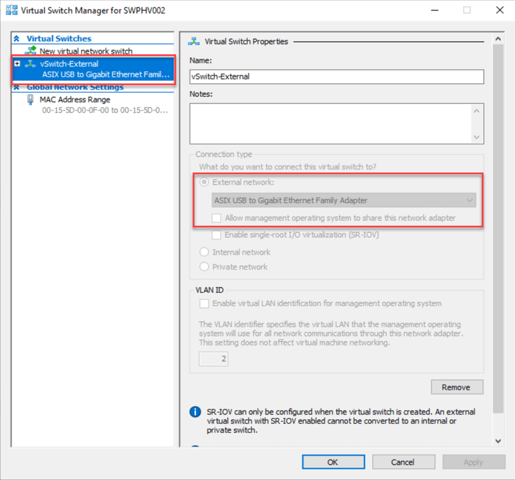 To verify the functionality of the newly created external vSwitch, you can attach it to the Network Adapter on both virtual machines (VMs) and examine whether these VMs are successfully connected to the network.