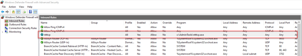 netsh advfirewall firewall add rule program=c:\<folder name>\ntttcp.exe name="ntttcp" protocol=any dir=in action=allow enable=yes profile=ANY