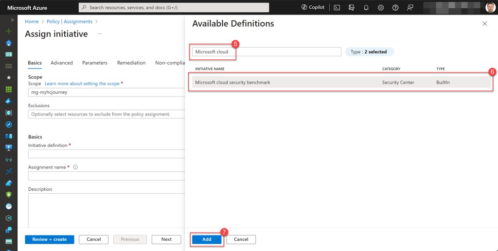 Here, type “Microsoft cloud” into the search bar and select the Microsoft Cloud Security Benchmark initiative. Click “Add” to apply.