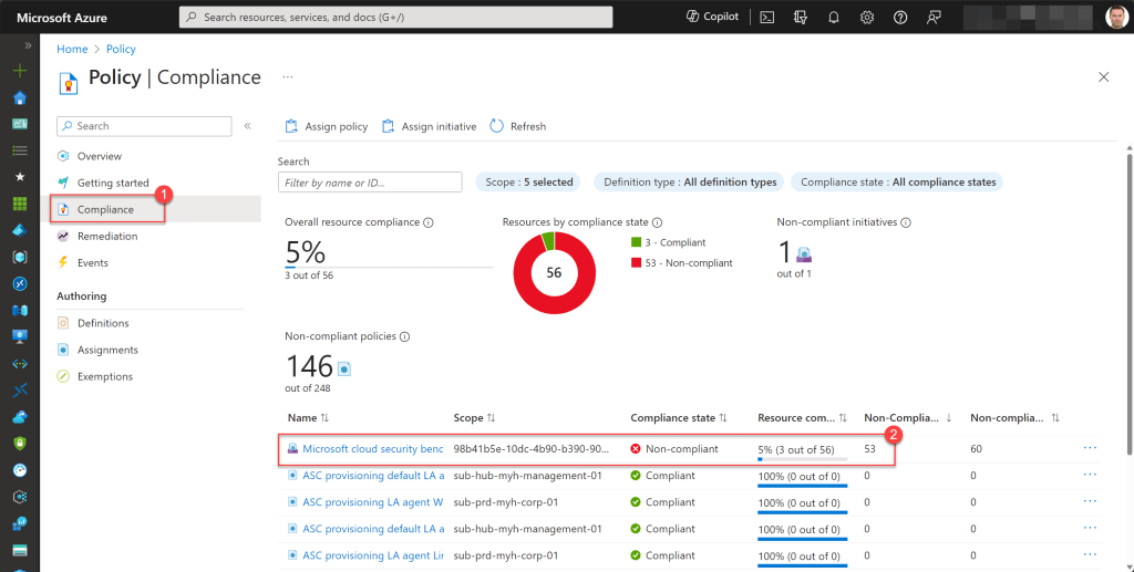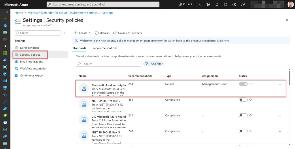 To do this, navigate to the Compliance section on the Policy page and select the Microsoft cloud Security Benchmark.