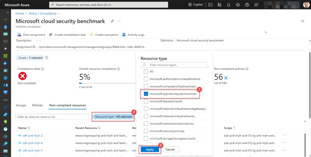 Next, choose “Non-compliant resources” and apply a filter for “Resource type: microsoft.hybridcompute/machines.” Then, click on “Apply.”