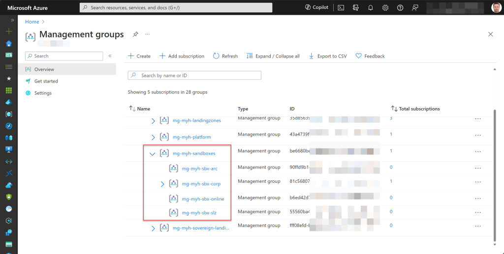 Recently, I’ve been encouraging customers to develop a more elaborate management group hierarchy extending beyond the top-level Sandbox group. This ensures even better and more logical organization of all Azure subscriptions under it.