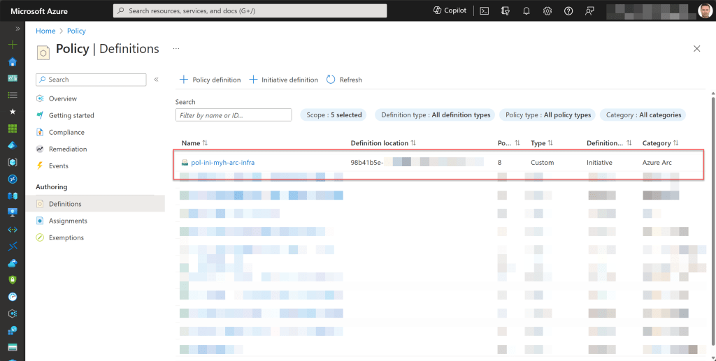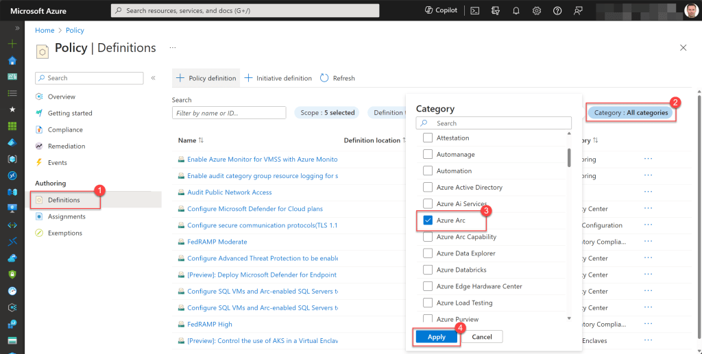 As a third option, you can also explore them by opening the Azure Policy page , clicking on Definitions, and filtering by categories such as “Azure Arc,” “Guest Configuration,” “Monitoring,” “Security Center,” and “Regulatory Compliance*” which include policies, initiatives, or a combination of both that can be applied to Azure Arc resources.