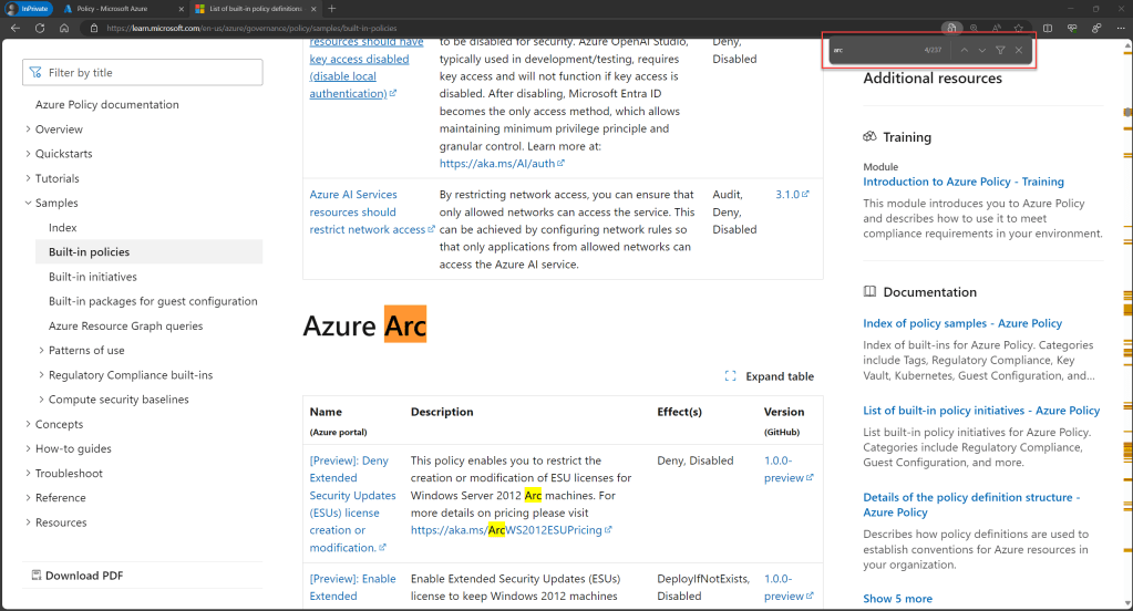 You can find a complete list of all built-in policies over here. To quickly locate Azure Arc-related policies, simply use the search function (Ctrl + F) in your browser, such as Edge, and type in “arc“.