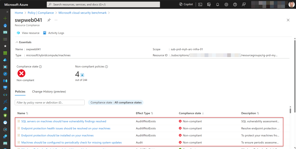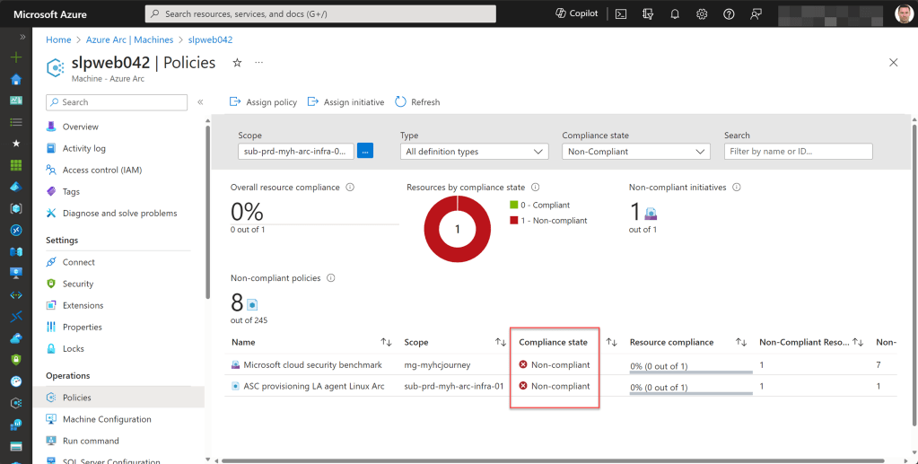 Once an initiative, such as the MCBS initiative, is assigned, you can also monitor its compliance status and identify non-compliant resources, such as your Azure Arc-enabled servers.