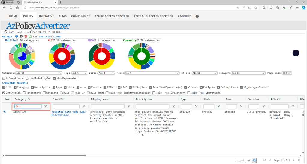 As another option, you can also use the AzPolicyAdvertizer website to browse through all built-in Azure Arc-related definitions and initiatives. Simply navigate to the “POLICY” or “INITIATIVE” tab and filter by the “Arc” category to locate all relevant ones.