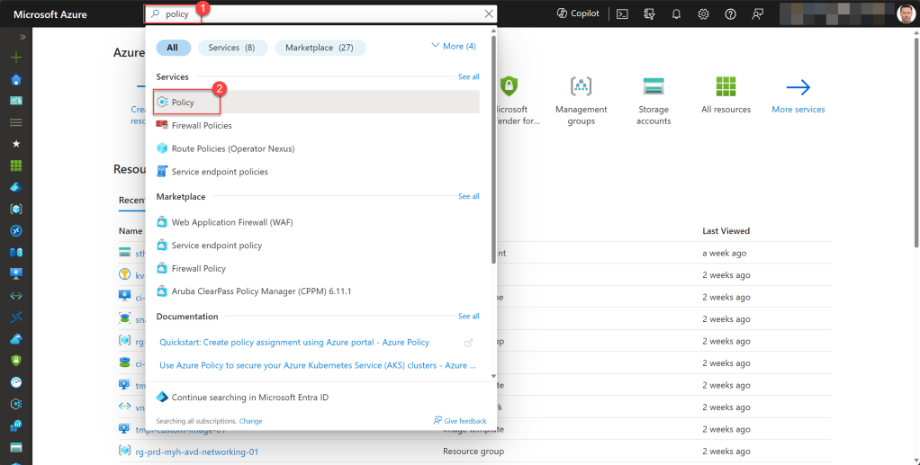 To do this, open Azure Policy from the sidebar or simply type “policy” into the global search box at the top bar, and then select “Policy” from the options.