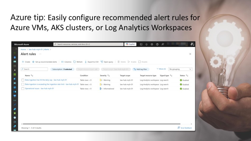 In this blog post, you’ll learn how to quickly enable built-in recommended alert rules through the Azure Portal for your Azure virtual machines (VMs), AKS clusters, and Log Analytics workspaces.