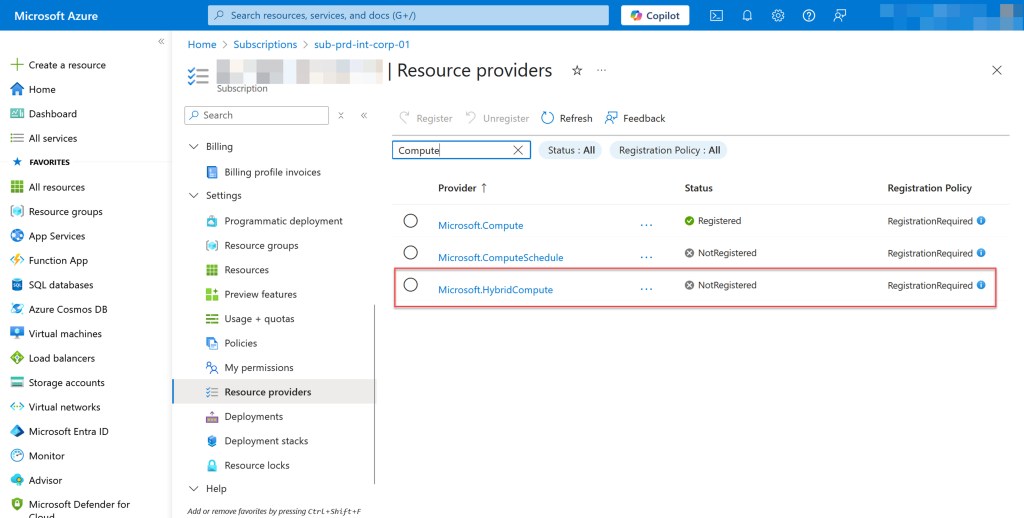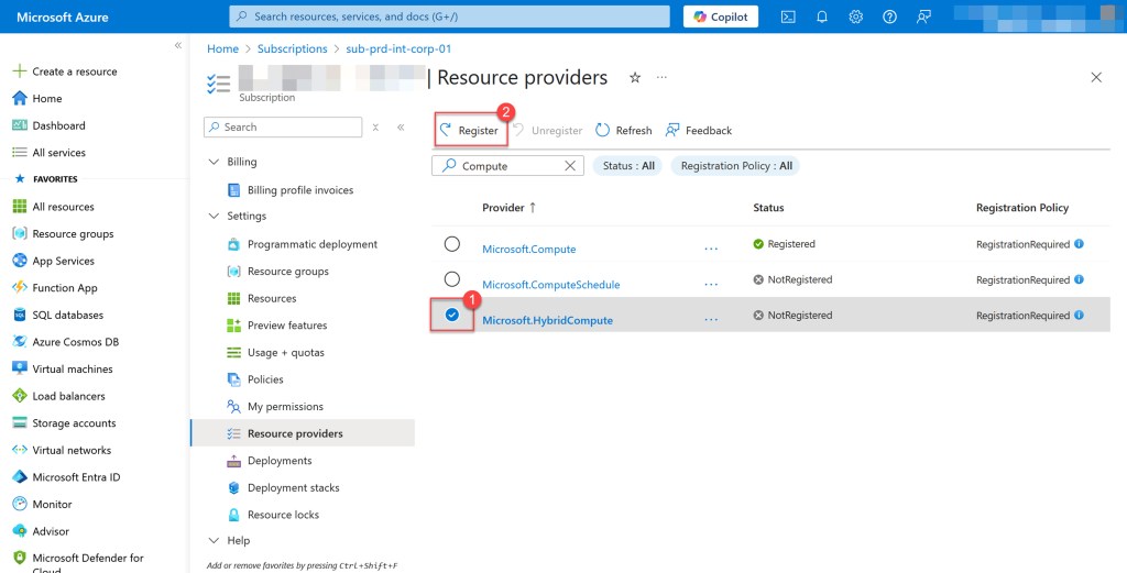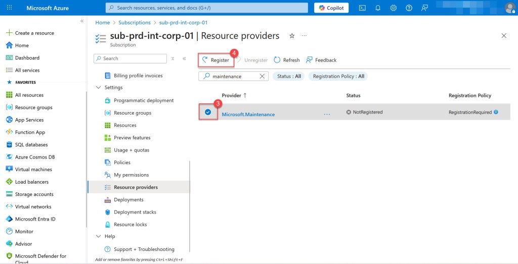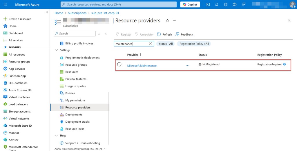 Then, go to the affected subscription under Subscriptions, select Resource providers, and search for Compute and Maintenance. Select any required resource providers that are unregistered, and click Register.