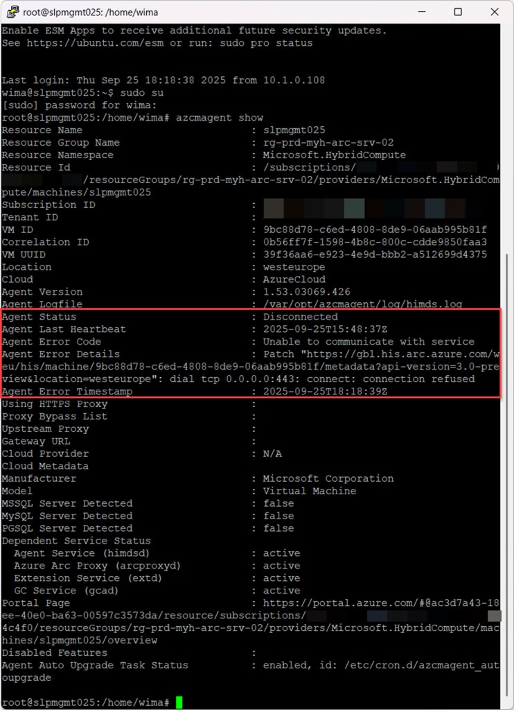 Then, just like on a Arc-enabled Windows server, you can type the azcmagent show command, which provides detailed information about the Azure Connected Machine agent, including the agent version, connectivity status, configuration details, heartbeat, last communication time, and any errors. This information is very useful for troubleshooting connectivity issues.
