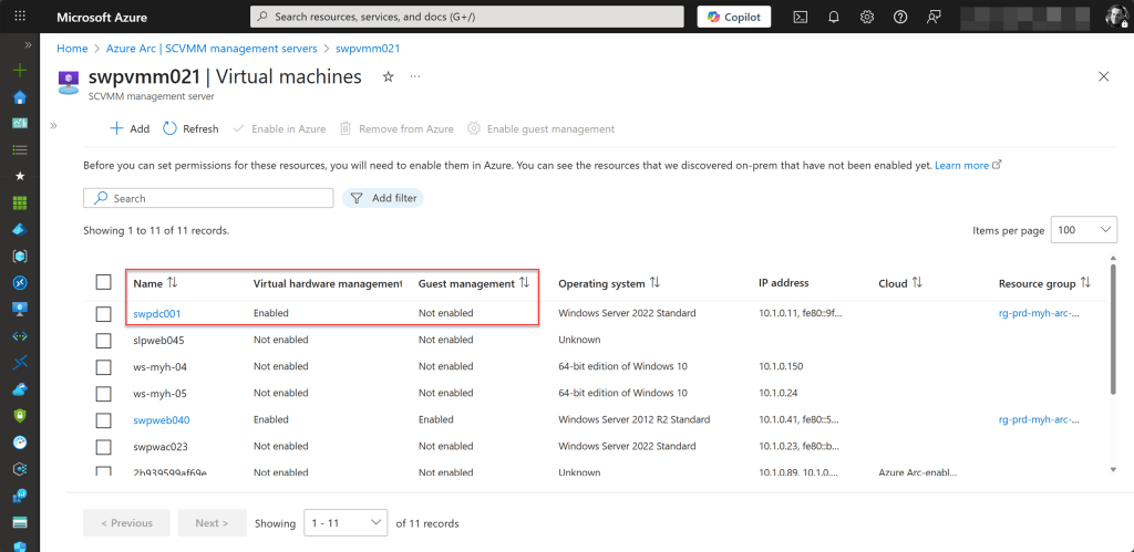 As a final possible status, a blank Arc agent status field can appear. This indicates the machine was onboarded through a platform such as SCVMM or vSphere, where virtual hardware management is enabled but guest management is not.