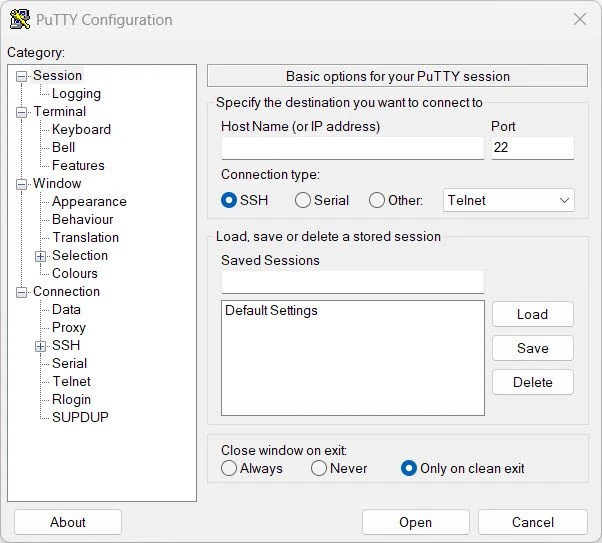 In the Host Name (or IP address) field, enter the server’s IP address or hostname. Make sure the Port is set to 22, which is the default for SSH, and select SSH as the connection type.