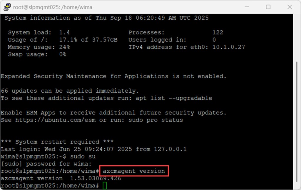 Then, just like on a Arc-enabled Windows server, you can type the azcmagent version command to check whether the agent is installed and see its current version.