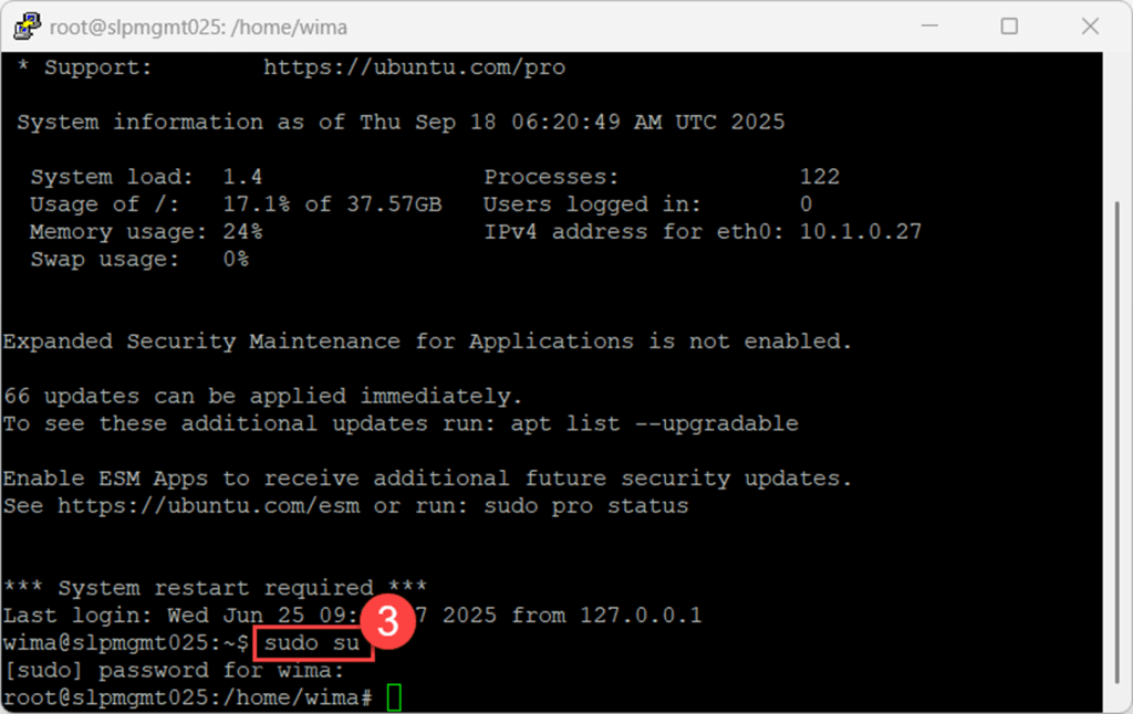 Next, log in as the root user by using the sudo command, followed by su or -i to start a root login shell.