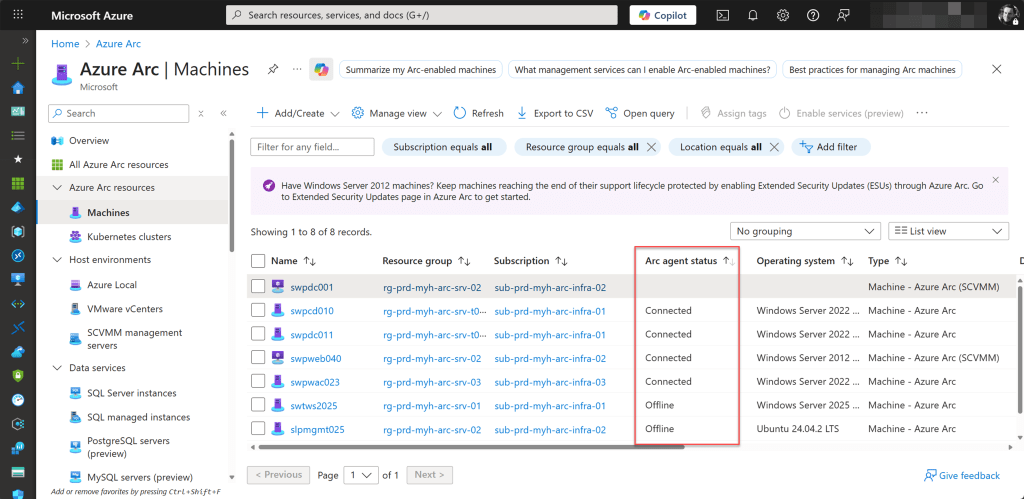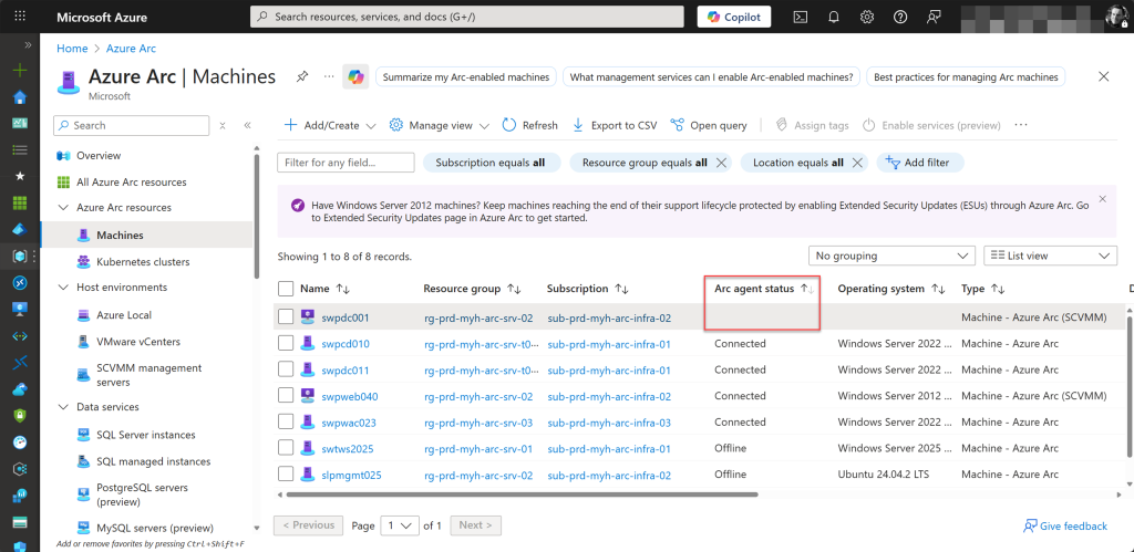 On the Azure Arc Machines page, you can view the status of all your onboarded machines under the Arc Agent Status field.