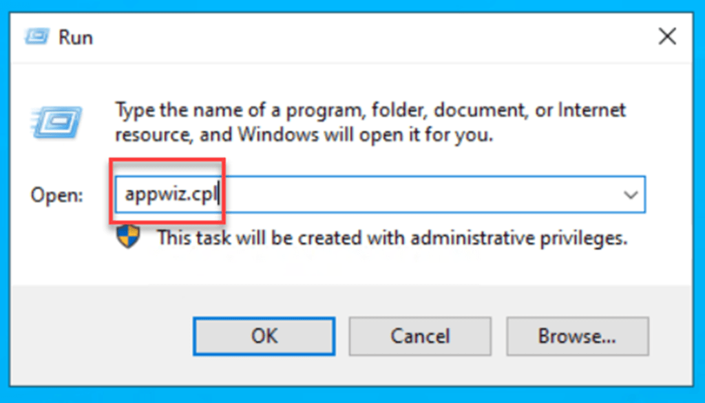 Next, open Run and type in appwiz.cpl to launch Program and Features.