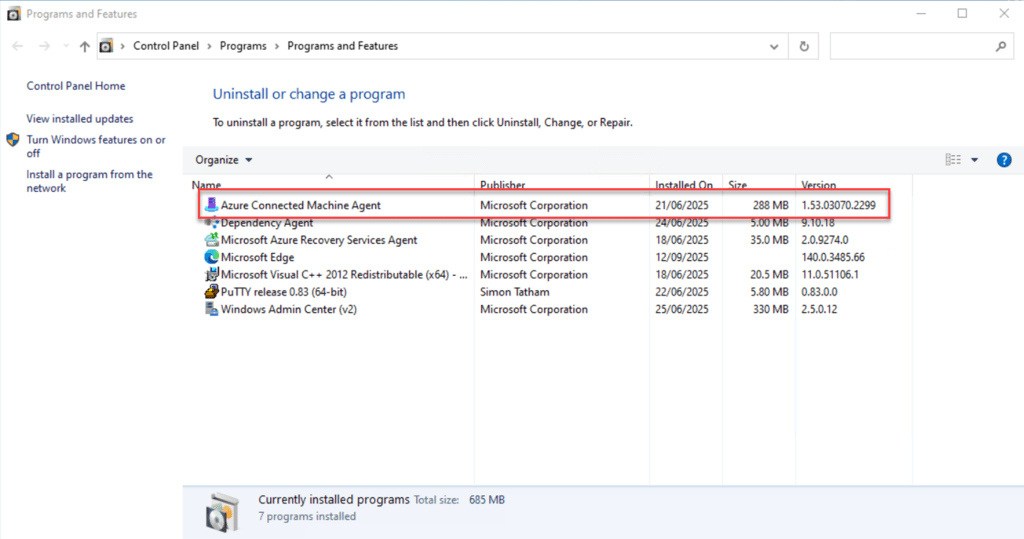 If the machine was successfully onboarded, you will see the Azure Connected Machine Agent listed. This view also shows the current version of the agent that is installed.