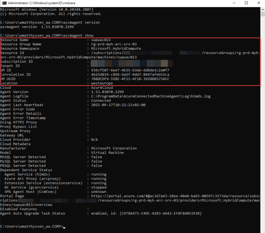 In addition to validating the Azure Connected Machine agent’s connection status via the Azure Portal, you can also verify that the agent is installed and functioning correctly on the onboarded machine itself.