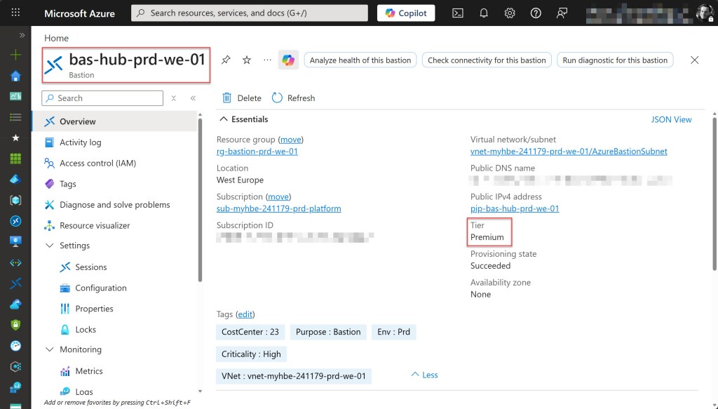 First, you need to obtain the full DNS name of your Azure Bastion resource, as this is required for the CORS configuration.