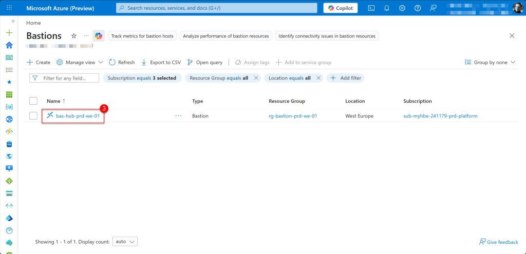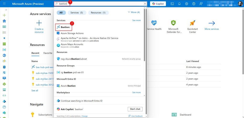 Because the Azure Preview Portal is required, open preview.portal.azure.com and sign in. Navigate to your Azure Bastion resource by searching for Bastion in the search bar.
