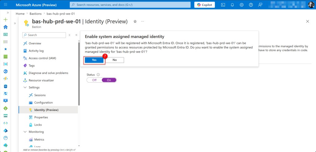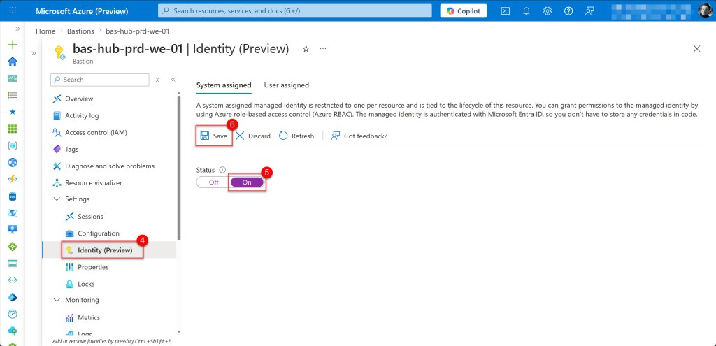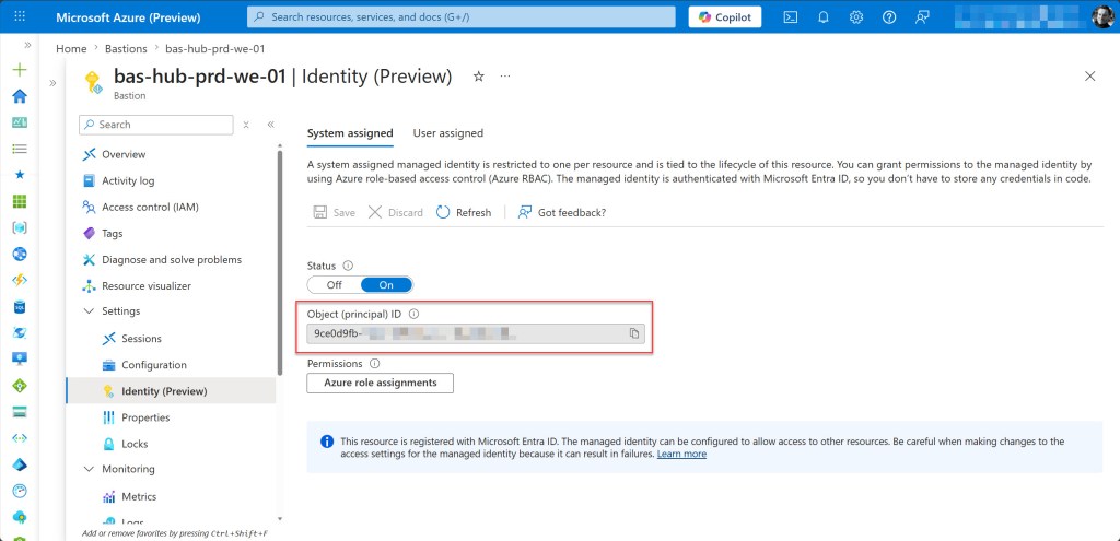 On the Bastion page, first enable a system-assigned managed identity on your Bastion resource. To do this, in the left-hand navigation pane under Settings, select Identity (Preview). On the System assigned tab, set the Status to On and click Save.