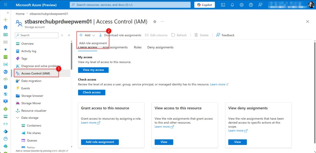 To do this, navigate to your storage account and select Access Control (IAM) in the left navigation pane, then select Add and click on Add role assignment.