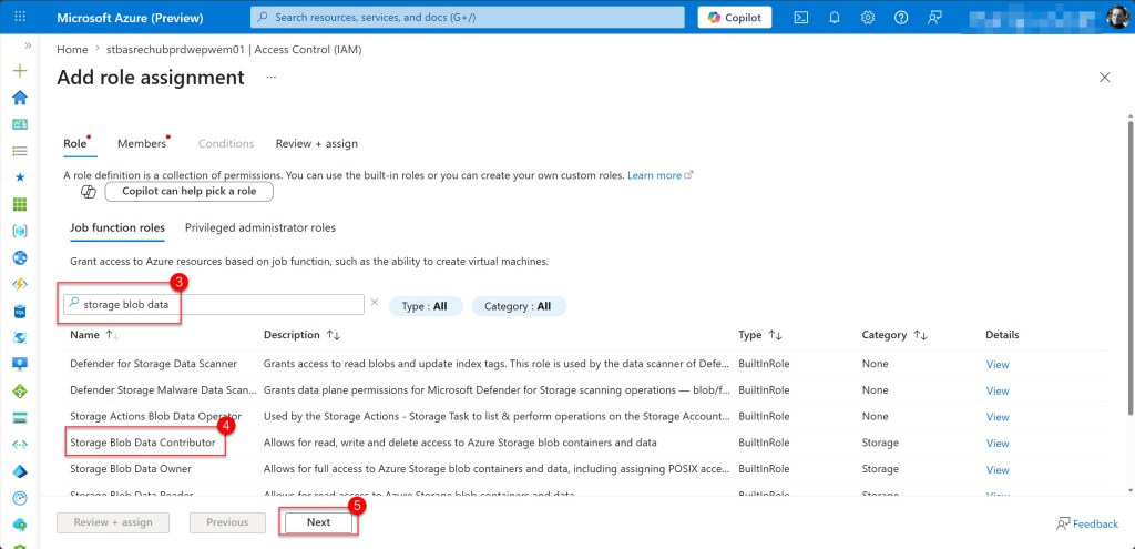 On the Add role assignment page, search for Storage Blob Data Contributor in the search box. Select it from the results to highlight it, then click Next to proceed to the members page.