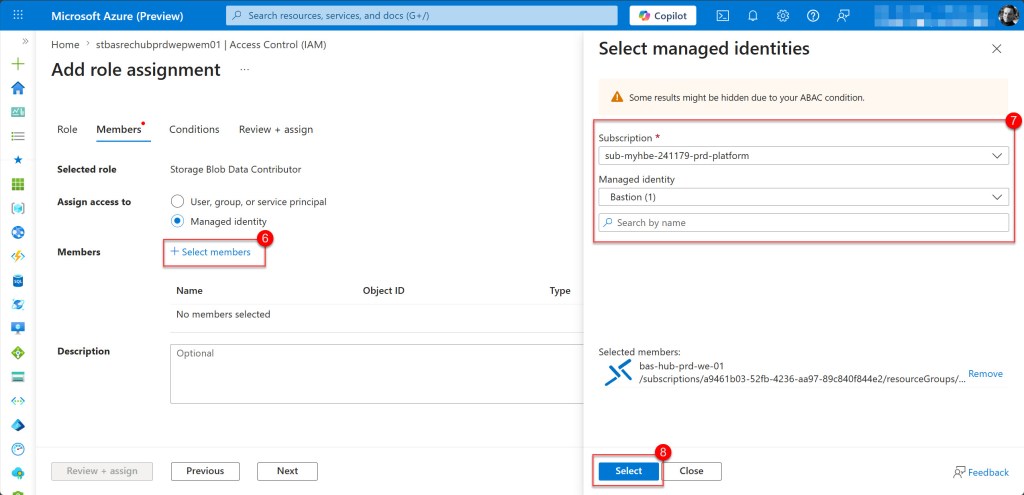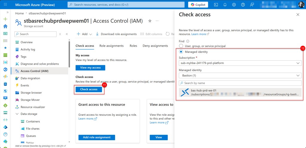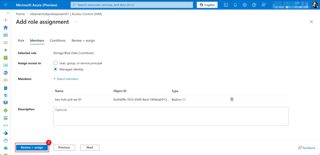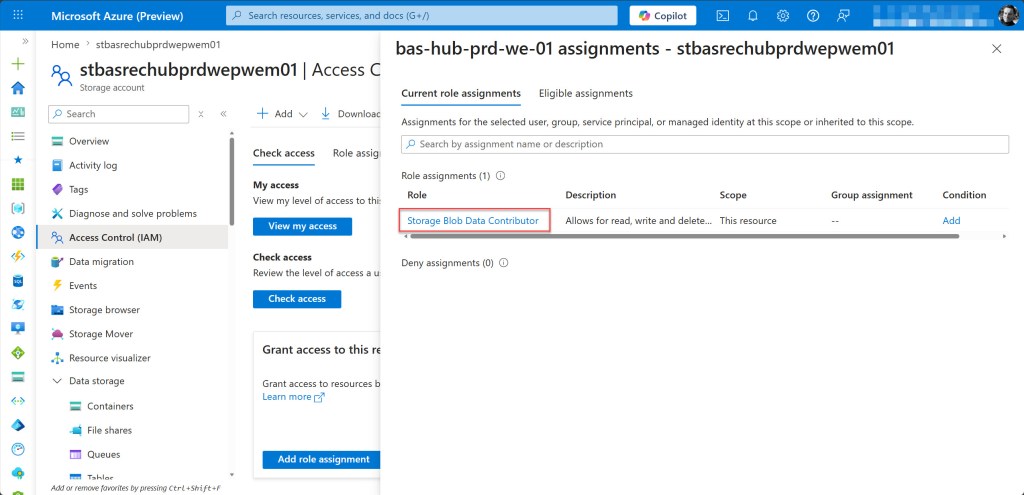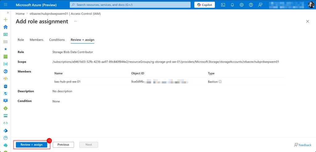 Now that the managed identity exists on the Bastion resource, you need to assign it the Storage Blob Data Contributor role on the storage account. This gives the Bastion service the necessary permissions to write session recordings to the blob container.
