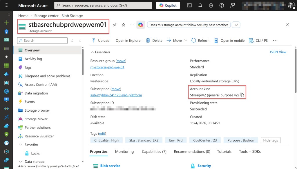 - A general purpose v2 storage account with a dedicated blob container for session recordings must be deployed in the same region as the Azure Bastion host to ensure optimal performance and avoid cross-region egress costs. The container’s public access level must be set to Private (no anonymous access) to ensure sensitive data is only accessible via Azure RBAC.