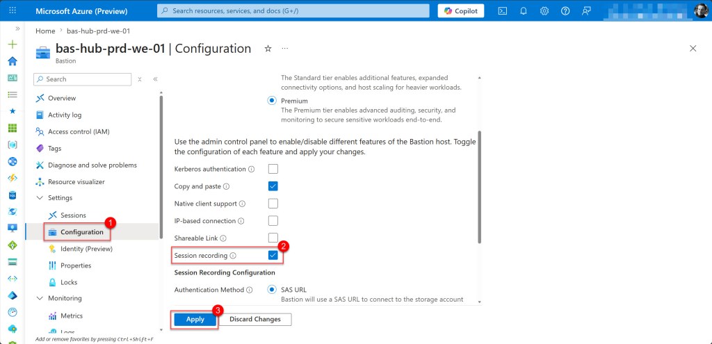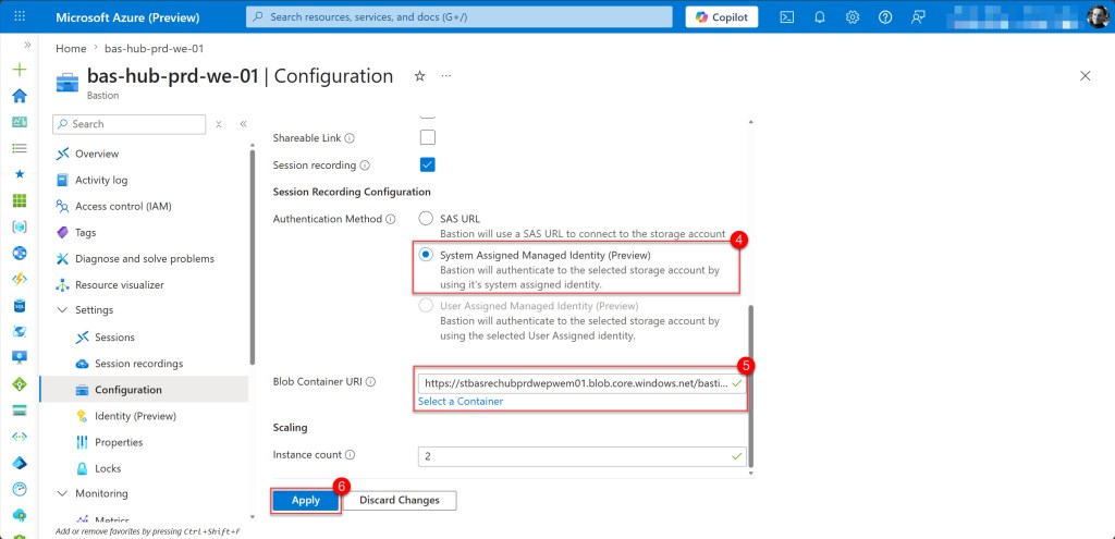 💡Managed identity support for Azure Bastion session recording is currently in Preview at the time of writing. As this is a preview feature, it is recommended to test this in a non-production environment first